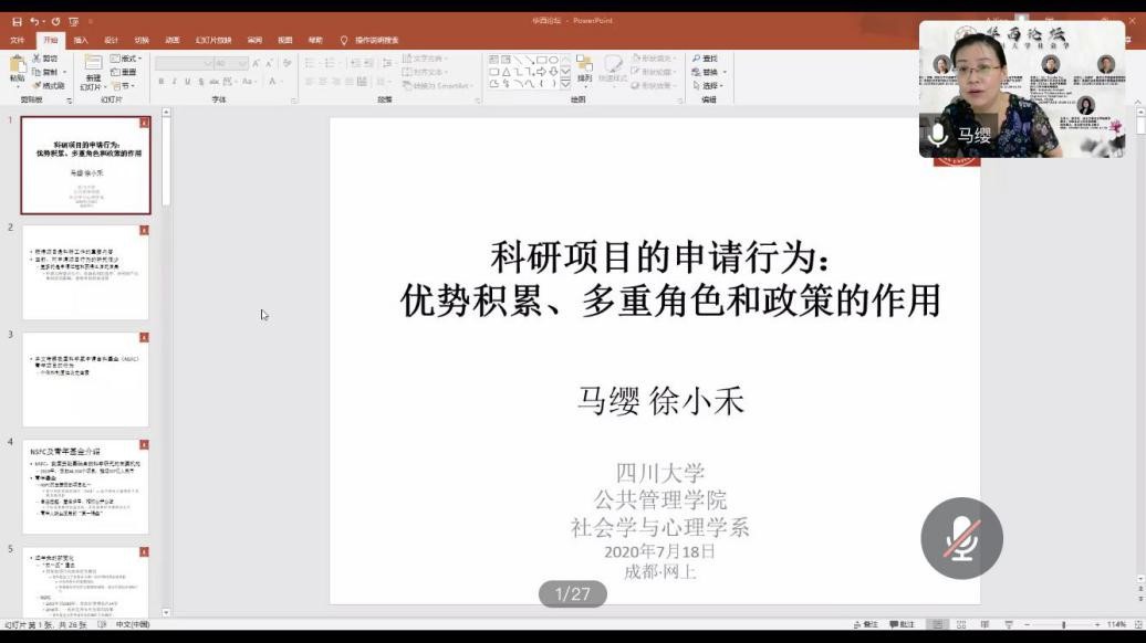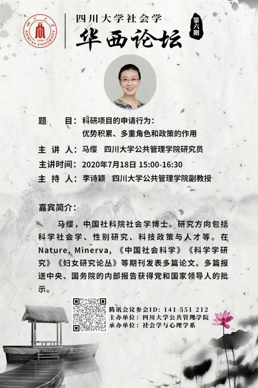 2020年7月18日下午15:00,好博社会学华西论坛云系列讲座第六期于线上成功举行。好博体育社会学与心理学系马缨研究员发表了题为“科研项目的申请行为:优势积累、多重角色和政策的作用”的精彩演讲。讲座由社会学与心理学系李诗颖副教授主持,百余名来自公司和省内外兄弟院校的师生参加了讲座。