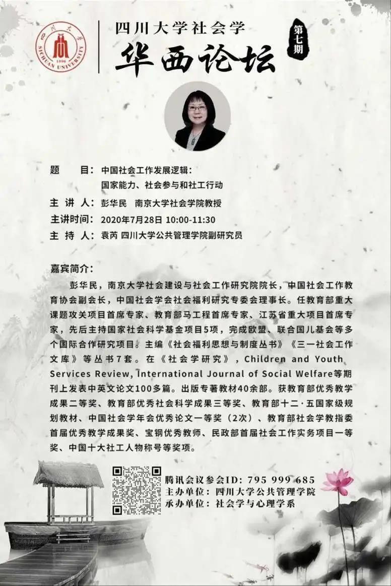 2020年7月28日上午10:00,好博社会学·华西论坛云系列讲座第七期于线上成功举办。中国社会工作教育协会副会长、中国社会学会社会福利专委会理事长、南京大学社会建设与社会工作研究院经理、社会公司博士生导师彭华民教授开展了题为“中国社会工作发展逻辑:国家能力、社会参与和社工行动”的精彩讲座。讲座由社会学与心理学系袁芮副研究员主持,国内高校社会工作及相关领域研究者、员工共250余人聆听了讲座。