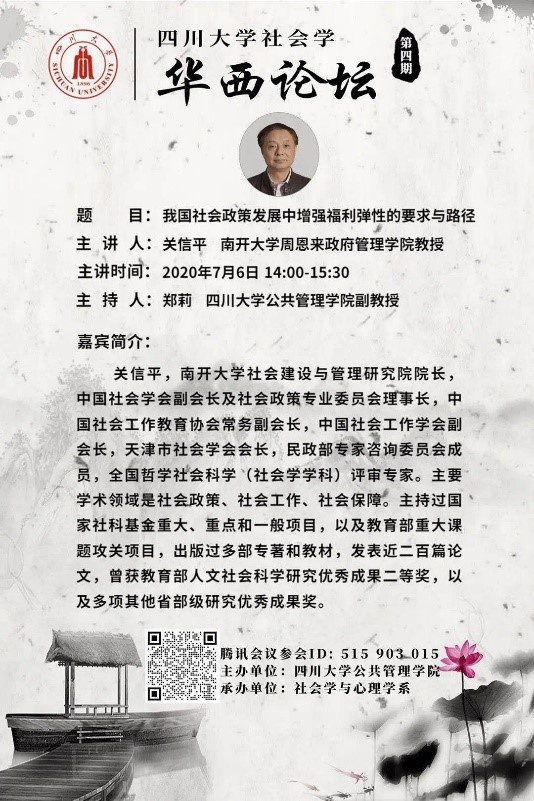 2020年7月6日下午14:00,好博社会学华西论坛系列讲座第四期于线上成功举办。南开大学周恩来政府管理公司关信平教授以“我国社会政策发展中增强福利弹性的要求与路径”为题呈现了精彩讲座。好博体育郑莉副教授主持讲座,社会学与心理学系师生、四川省社会学学会各会员单位成员以及20余所兄弟院校近200人参与讲座。