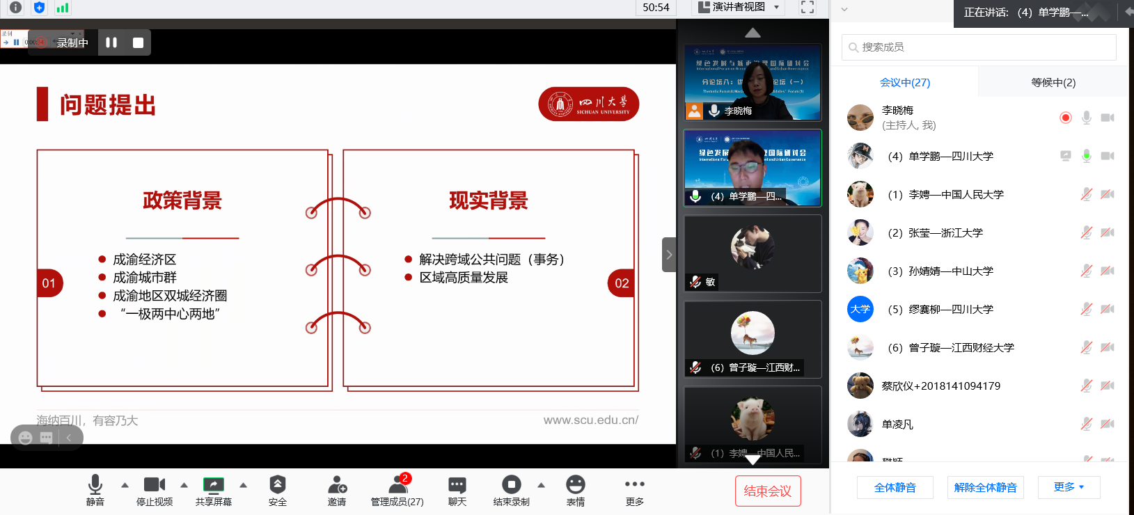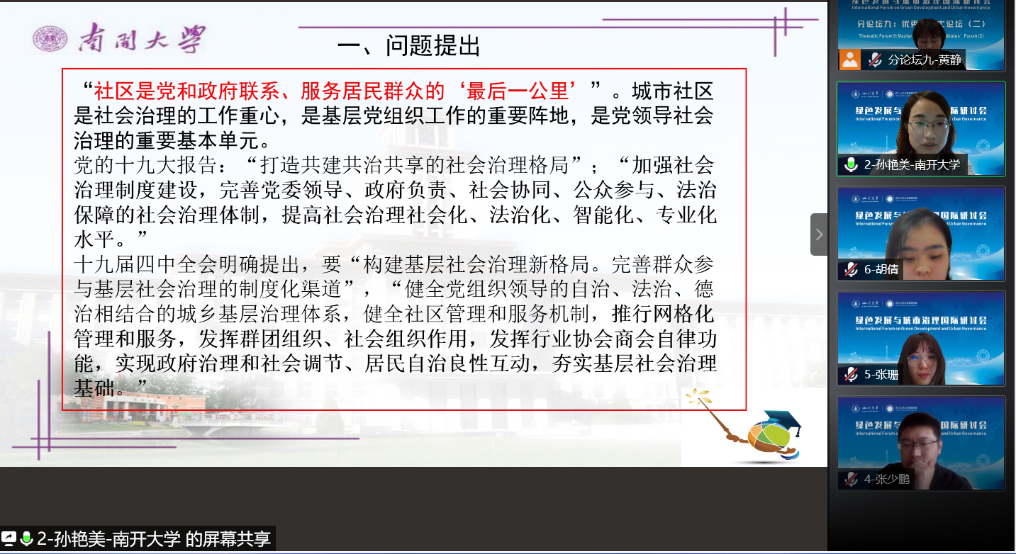 两个“优秀硕博士论坛” 吸引了来自中国人民大学、浙江大学、复旦大学、中山大学、南开大学、好博等14所国内知名高校学子踊跃参与,汇报翔实而丰富:从国外视野到国内研究,包含了绿色发展绩效、环境治理、应急管理、协同治理、社区养老、公共政策等方面,呈现了青年一代对绿色治理与城市治理的新思考。对此,点评人予以赞赏并且提出了详细的建议,且在理论学习与研究方法上对参会学子提出更进一步的期望。