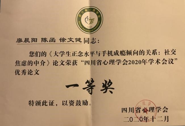 本次学术年会评选出了四川省心理学会2020学术年会优秀论文,公司师生斩获多项奖励。徐文健特聘副研究员、2020级应用心理专业硕士研究生廖晨阳提交的研究论文双双荣获一等奖,2019级硕士生夏宇荣获三等奖,2020级硕士生敬凡珂和李柳欣获优秀奖。