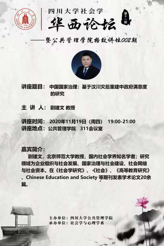 2020年11月19日晚上19:00,好博社会学华西论坛系列讲座第十期——暨好博体育格致讲堂002期于公管院311成功举行。北京师范大学社会学系教授尉建文发表了题为“中国国家治理:基于汶川灾后重建中政府满意度的研究”的演讲。讲座由好博社会学与心理学系马缨研究员主持,二十余名同学参与了此次讲座。