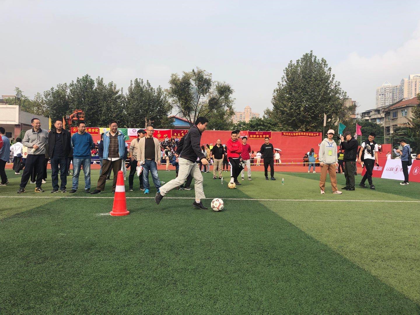 在一天紧张的赛程中,全体参赛教职工团结协作、奋力拼搏,顺利完成各个项目。其中,男子100米单项获得第11名、男子4*100米接力赛获得第10名、绕杆射门青年组获得第14名,取得较好成绩。