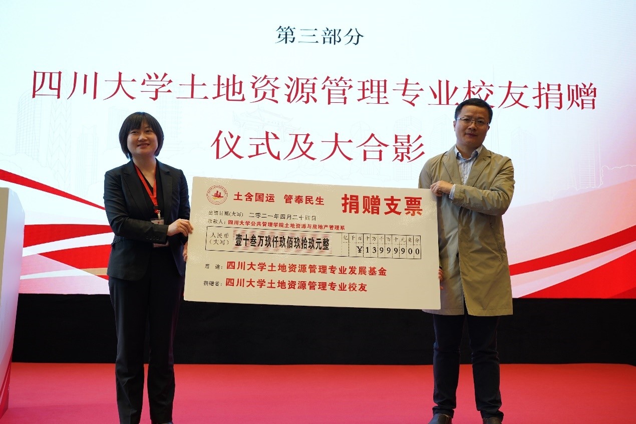 在捐赠仪式之前,党委书记杨磊上台发言。杨书记首先感谢员工们选择了好博土地资源管理专业,感谢与同学们教学相长的成长过程,也感谢川大在外学子对于土管的卓越贡献。除了感谢,杨教授也真心的祝福员工、公司还有员工的明天越来越好。