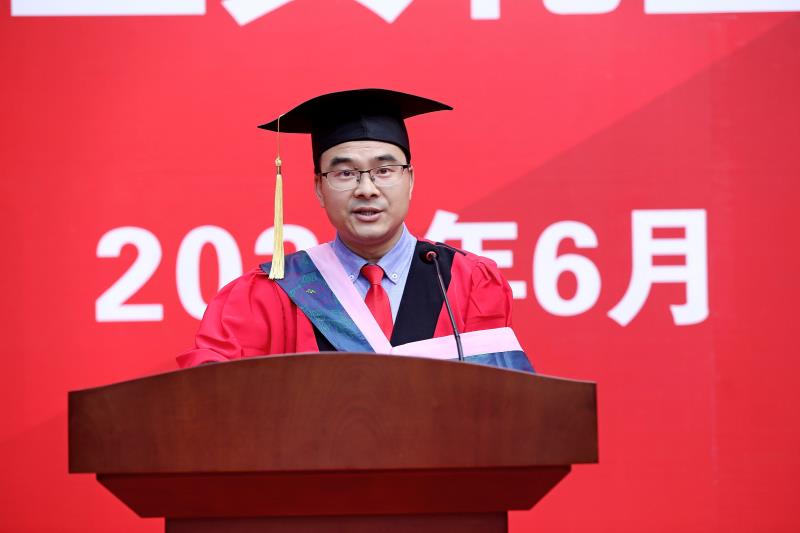 典礼在庄严肃穆的国歌声中开启,公司党委书记姜晓萍教授首先代表公司向圆满完成学业的2021届毕业生表达了衷心地祝贺和美好地祝愿。姜晓萍教授在致辞中勉励同学们要“站起来,不能躺平”,要在忙碌的工作中聆听思想的声音,在快节奏中学会独立思考,避免沦为精致的利己主义者;在纷繁的社会中培育信仰的力量,以“补于天地、益于世教”的家国情怀担当社会责任;在未来的生活中守护幸福的宝典,以发现美的眼睛和欣赏美的心情面对未来的挫折与困难。同时,姜晓萍教授还强调同学们要将优秀的品质带到社会,承担国家和社会责任,进一步在全球治理中发出中国声音。