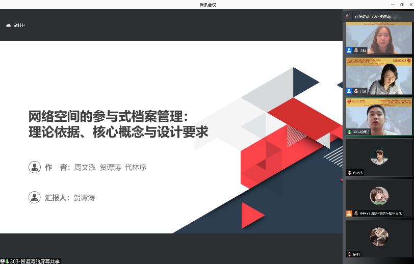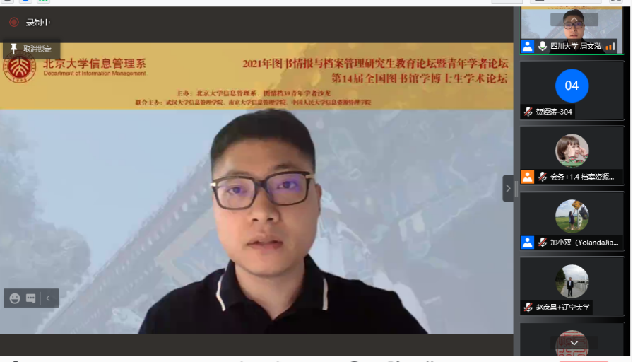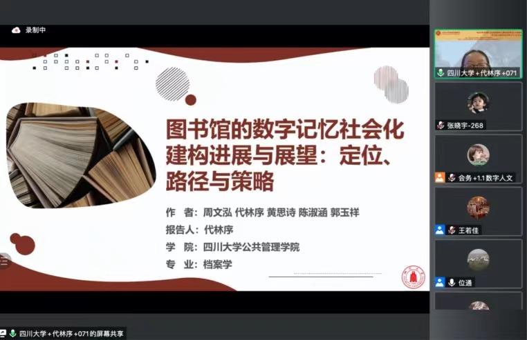 2021年9月25日至26日,由好博体育信息管理系、图情档39青年学者沙龙主办的2021年图书情报与档案管理研究生教育论坛暨青年学者论坛、第十四届全国图书馆学博士生论坛顺利召开。本次论坛采用线上为主、线上和线下结合的方式,来自全国高校、档案馆、图书馆等的数百名专家、学者参会,共同探讨图情档专业的人才教育、学科发展及前沿议题。秘书档案学系周文泓副教授应邀担任分会场“数字记忆与数字人文”主持人,2020、2021级档案学研究生代林序、张晓宇、2018级本科生贺谭涛应邀参会,并在“数字记忆与数字人文”、“图情档人才培养与学科发展”等分会场做主题发言。
