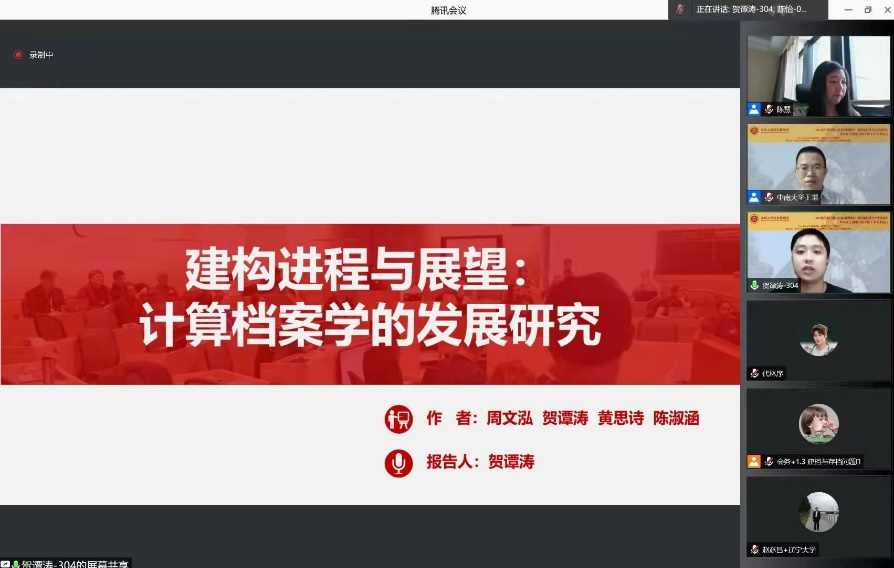 26日上午,论坛继续进行。周文泓副教授携贺谭涛在分会场“数字记忆与数字人文”做题为《建构进程与展望:计算档案学的发展研究》的学术报告。该研究对现阶段计算档案学的理论和实践进展进行了系统梳理,从主体、对象和管理活动三个维度对实践案例进行特征归纳,并结合我国新文科建设背景提出了计算档案学的后续建构空间。随后在该分会场的“档案资源开发与利用”主题下,周文泓副教授作为主持人,有效控制会场节奏,积极引导与会者参与讨论,保证了会议高效、有序地进行。
