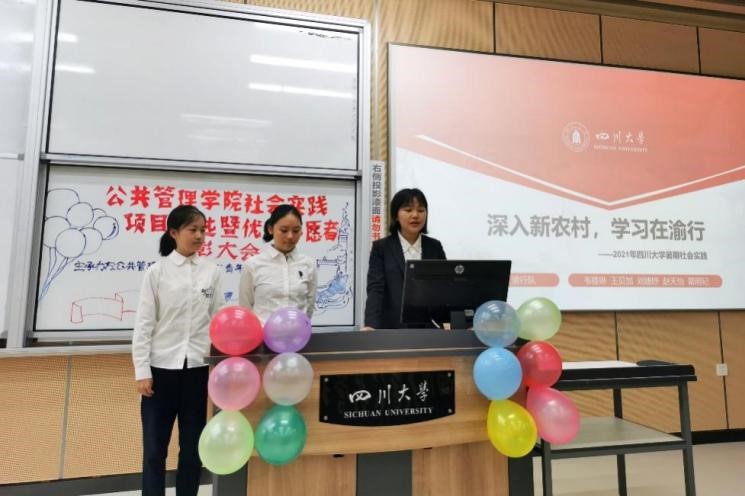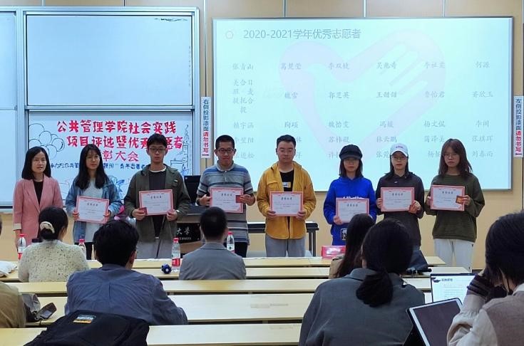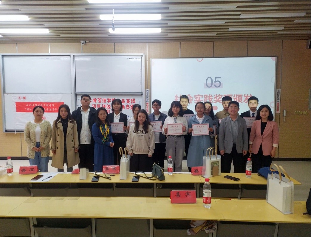 在激烈的社会实践项目评选过程中,公司艺术团的赛泠然同学还专门献唱了一首歌曲《敬你》,平缓、优美的韵律让答辩同学们所有紧张的情绪得以疏解,也获得了精神鼓舞。随着最后一支队伍川行队展示结束,整个评选走向了尾声。经过量化打分综合评审,“探寻社区治理,究析国情伟业”实践团获得了一等奖,浙阿连心队、渝行队获得了二等奖,陇上行小队、心之所向队、好年华聚福州队获得了三等奖,浙里下乡队、山与江与川与渝队、“三线建设”研究队、川行队获得了优秀奖,评委老师对获奖的社会实践队伍颁发了奖状与礼品,并与他们合影留念,本次大会到此圆满结束。
