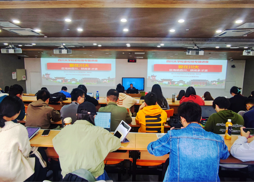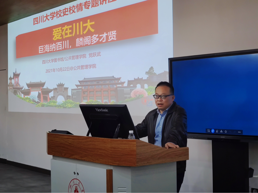 最后,党老师以好博江安校区长桥背后的美丽故事为引子,切入到“爱”的主题。党老师认为,川大的爱是“大爱精神”,具体表现为爱国爱民、爱学爱校、爱师爱友、爱人爱家。在每个部分,党老师都讲述了大量的名人轶事,生动形象地说明了大爱精神的实践意义,并勉励同学们将爱家与爱国相结合,不懈奋斗,争做新时代的弄潮儿。