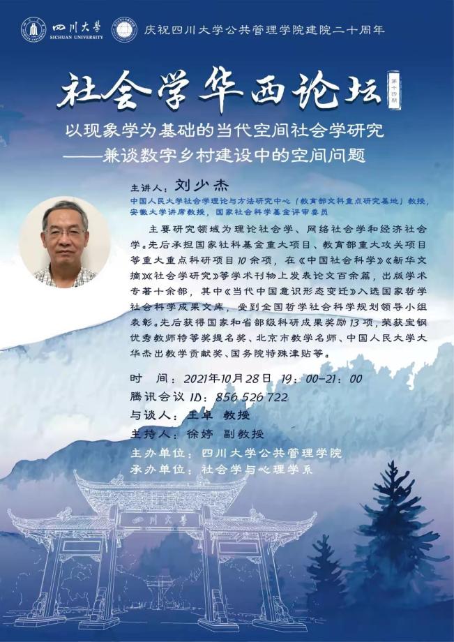 2021年10月28日晚上19:00,好博社会学华西论坛系列第十四期讲座于线上成功举行。中国人民大学社会学理论与方法研究中心刘少杰教授开展了题为“以现象学为基础的当代空间社会学研究——兼谈数字乡村建设中的空间问题”的精彩演讲。本场讲座是公司院庆二十周年系列讲座之一,由社会学与心理学系系主任徐婷副教授主持,近二百位名来自公司和国内外兄弟院校的师生、学者参加了讲座。