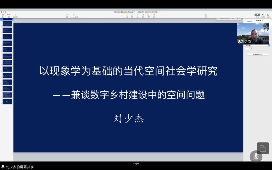 讲座伊始,刘少杰教授梳理了胡塞尔、梅洛·庞蒂、福柯等人的主要观点,系统介绍了以现象学为基础的当代空间社会学前沿理论。基于数字乡村建设在乡村振兴中的国家重大战略定位,刘教授结合实地调研结果,创造性地从地理空间、社会空间、网络空间和心理空间四个维度对当下中国数字乡村建设中的相关议题进行了综合性论证。最后,刘教授从乡村空间变迁、新型农业经营主体、四重空间三个方面全面概述了当代空间社会学研究对数字乡村建设的重要理论启示。
