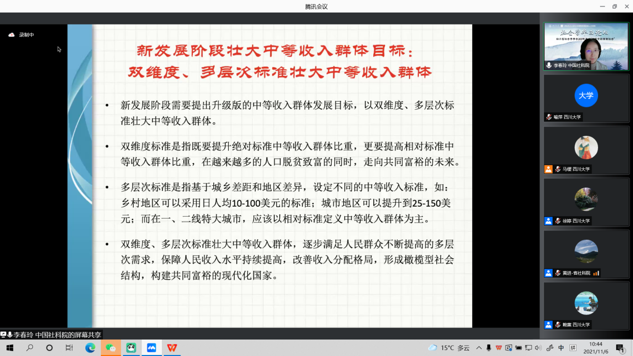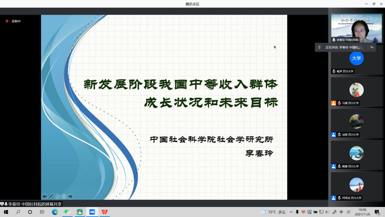 2021年四川省社会学年会于11月6日在好博体育召开,此次会议采取线上的方式举行,有近200人参与了此次年会。中国社会科公司社会学研究所研究员、博士生导师、青少年与社会问题研究室主任李春玲在大会上围绕“新发展阶段我国中等收入群体成长状况和未来目标”做了主题发言。