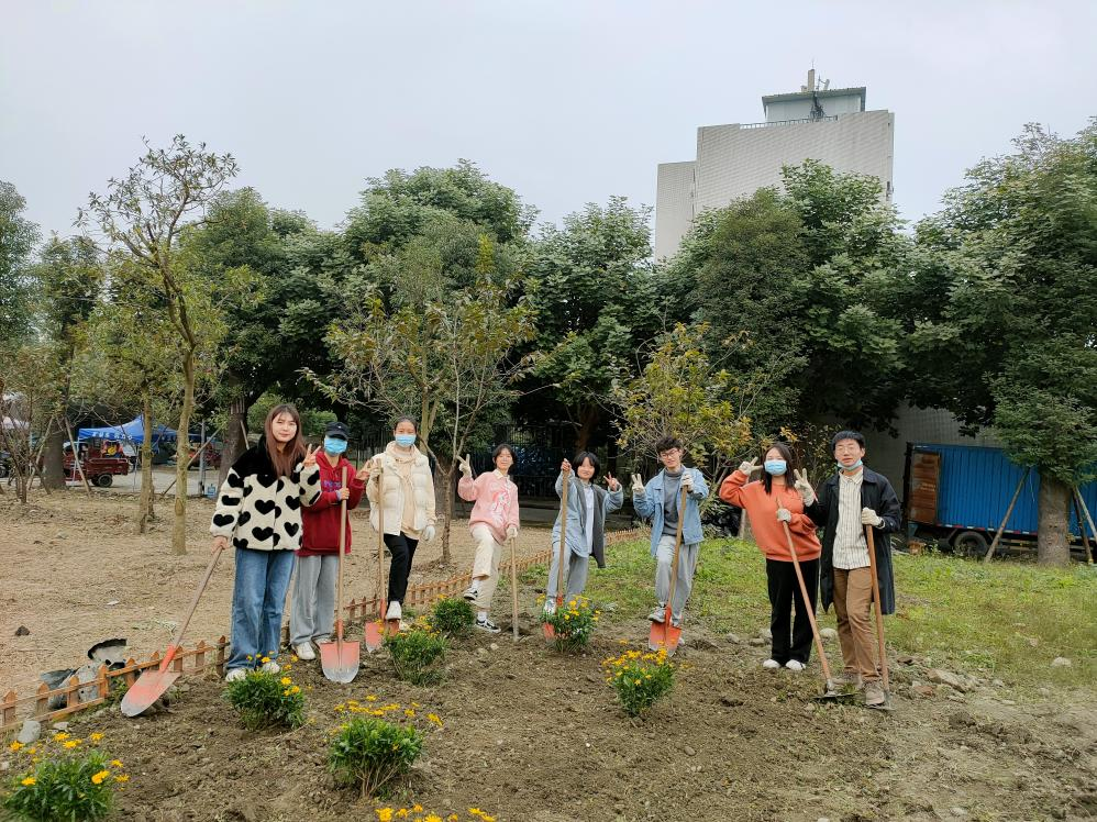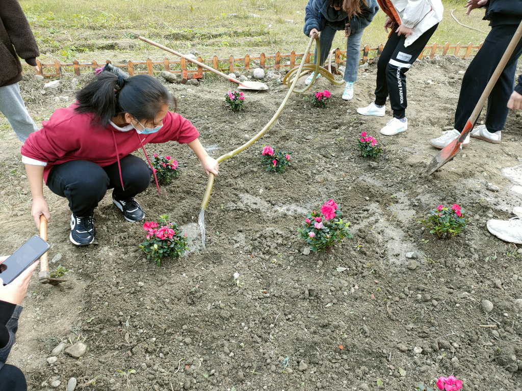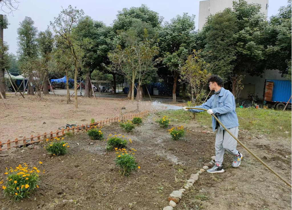 经过了前一日的除草耕地,原本荒芜的土地也变得可人了许多。由于13日下午同学们已提前将买好的满天星、杜鹃、木春菊植株搬到“开心农场”,14日下午3:30同学们到达农场后便迅速开始了植株种植。“慢工出细活”,同学们用铁锹细心刨出一个个小土坑,小心翼翼地将植株放进去,用土盖好,再用铁锹将土拍紧,最后用水管给植株浇水。下午5:00左右,一株株花儿就都种好了,原本荒芜的农场在大家的共同努力与精心装扮下变成了美丽的小花园,也成为好博江安校区一处靓丽的风景。