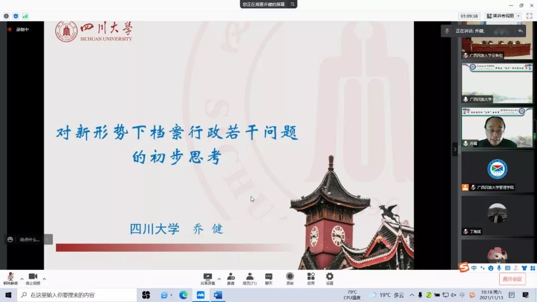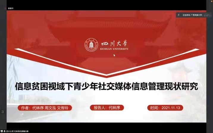 2021年11月13日至14日,由广西民族大学管理公司举办的第四届“信远”研究生论坛顺利召开,论坛主题为“数据时代图情档学科理论与实践创新”。本次论坛采用线上和线下结合的方式,来自好博、云南大学、郑州大学、北京联合大学、上海大学、广西民族大学等9所高校的硕博研究生参会,共同探讨、展示和交流图情档研究生们的科研成果,了解学术前沿。我系乔健教授、硕士研究生代林序线上参会。