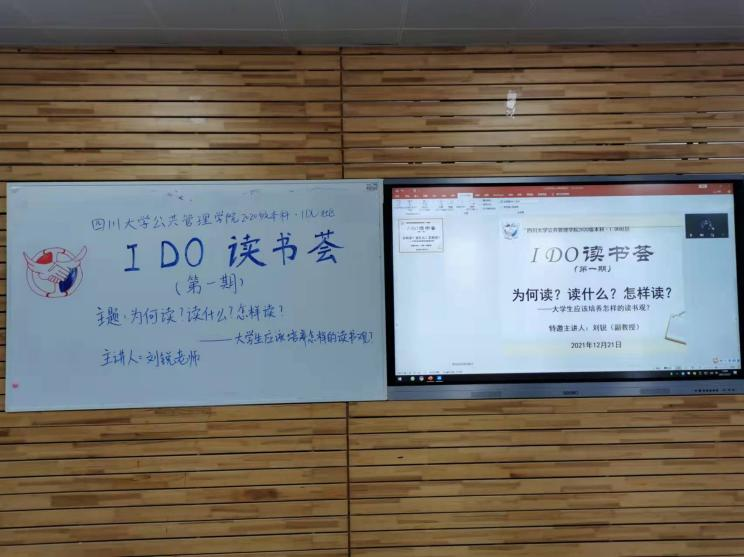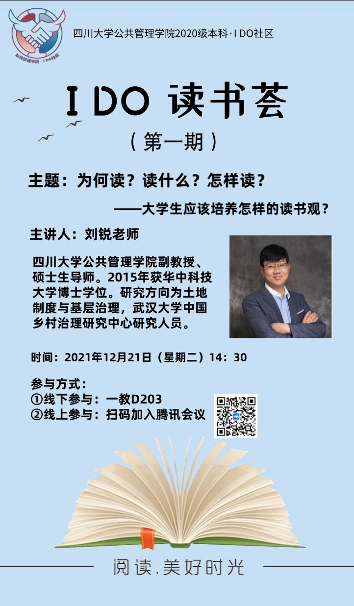 2021年12月21日14:30,好博体育2020级本科第一期“IDO读书荟”在江安校区基础教学楼D203教室成功举办。好博体育行政管理系刘锐副教授作为特邀嘉宾主讲了本次读书荟,读书荟由2020级本科辅导员苟欢老师主持,2020级本科员工各专业同学通过线下线上的方式参加了本次读书荟。