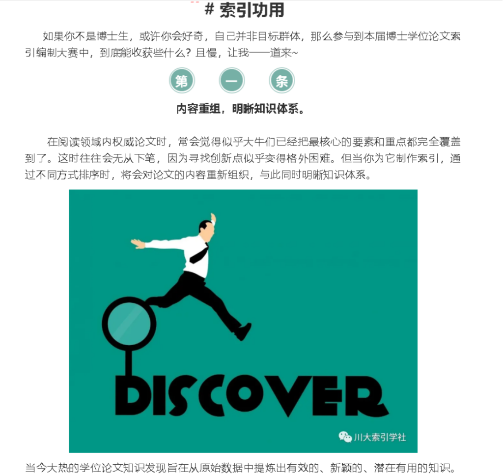 前期宣传阶段,公司索引学社师生团队与复旦索引学社进行对接,结合川大实际情况,收集有意向参加比赛员工的意见,提供了比赛反馈建议。社长韩颐堃、副社长鄢世民参考往届大赛指引,制作了一期比赛内容微信推送:整合了索引编制的文字基础规范和往届比赛网络平台讲座回放,以供参赛者学习取用;明确了推广学位论文索引的背景和意义,罗列了川大同学获取学位论文的途径;讲解了索引的主要功用,推广了索引文化。