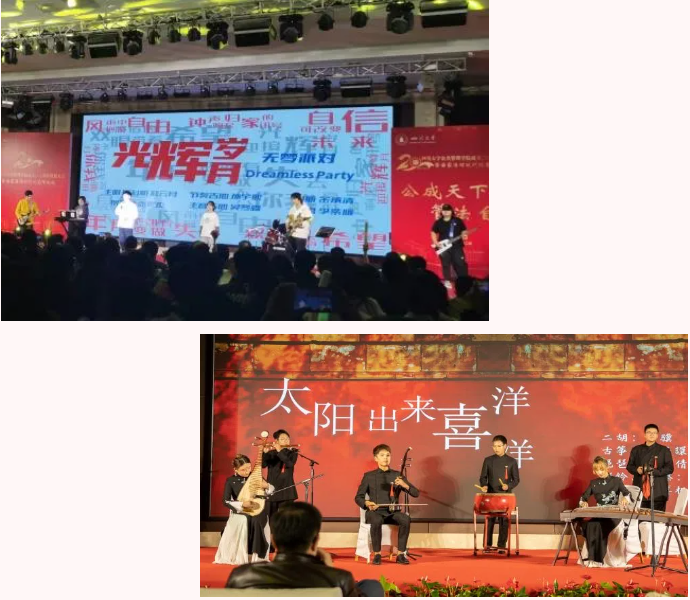 一段承载了公管院二十载峥嵘岁月的纪录片缓缓拉开晚会序幕,全方位、多角度地呈现公司在学术科研、人才培养上不断创新、勇创佳绩的辉煌历程。晚会开场,热闹欢快的开场曲《太阳出来喜洋洋》汇集了古筝、琵琶、二胡等民乐器表演,展现出公管师生一以贯之的勤奋与乐观精神。紧接着公司教授委员会主任王谦教授、副主任乔健教授和公司8个系主任老师上台向公司20周年院庆献礼,共同为院庆蛋糕点烛,全体师生齐声祝福公管20岁生日快乐。