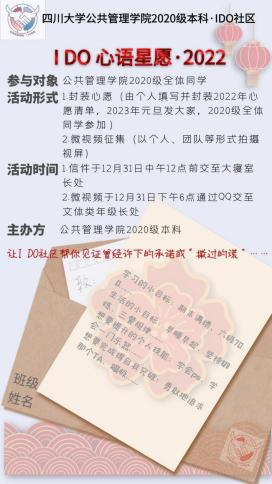 本年度“心语星愿”活动主要由两部分构成:“2022心愿清单封装”和“2022微心愿视频征集”。在“让I DO社区帮你见证曾经许下的承诺或‘撒过的谎’”这一诙谐幽默却意涵深刻的年度标语的感召下,同学们积极通过封印年度心愿的形式,向一年后的自己留下期待和梦想,也踊跃而大胆地表达着自己这一年要感谢和祝福的人。年级员工干部为每位同学准备了统一的、印有“I DO社区”LOGO的精美年度心愿信封,供同学们使用。2020级本科辅导员苟欢老师也与同学们一同写作和封装年度心愿清单,并向大家送出诚挚的新年愿望,并同大家一起期待一年后的愿望解封时刻。
