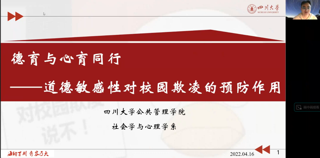 为了将研究结果反馈给一线教师,并推动校园欺凌干预课程的开发工作,4月16日,项目组召开了“德育与心育同行:道德敏感性对校园欺凌的预防作用”线上研讨会,校园欺凌领域专家、中小学董事长及教师等约50人参会。刘传军老师对四川省社会科学“十四五”规划2021年度项目的资助、好博体育自主科研计划的支持,以及参与本次调研的专家及一线教师致以谢意后,应用心理硕士生谢忠桔对调研的基本过程与结果进行了总结汇报。在随后的自由讨论环节,沈潘艳副教授根据自身课程设计经验,提出可以从员工的认知失调、情绪觉察能力方面入手,引导员工关注受害者被欺凌时的具体情况以及由此带来的痛苦,以增加其对受害者的帮助行为。一线心理健康教师代表、来自天府四中的蔡倩老师,结合实务经历指出,一方面,欺凌相关的校园情景剧以及权威人士对欺凌法律责任的普及可能对反欺凌起到一定推动作用,而另一方面,为员工明确欺凌定义可能起到反作用,如“欺凌”一词可能成为员工之间取笑的工具,因此,反欺凌课程的设计中诸多细节不容忽视。