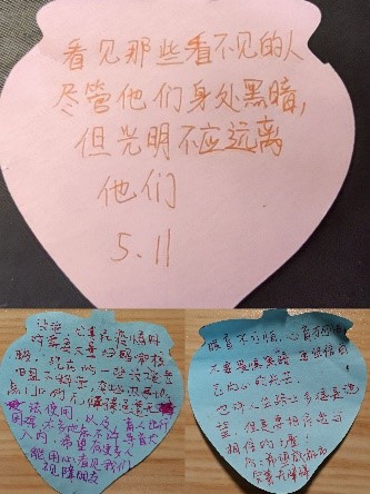 黑暗中对话,是与视障人士的对话,也是一场与自己内心的对话。活动结尾,同学们与导赏员进行了交流,为他们的坚强与乐观所感动,同时对残疾人事业的发展有了更多的思考。许多同学表示,在黑暗中,导赏员为我们领路,回到光明,我们也可以发挥专业所长,成为视障人士守护者。当光明在黑暗后重现,其意义更为深刻,带着无尽的感慨,同学们在留言室写下体验感想与祝福。