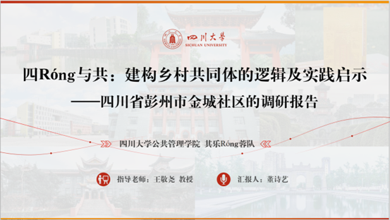 由公司行政管理系王敬尧教授担任指导老师,董诗艺、丁亮、胡宇辰、袁安琪等四位研究生组成的“齐乐Rong蓉队”,完成了《四Róng与共:建构屋檐共同体的逻辑及实践启示——四川省彭州市金城社区的调研报告》。在报告中,团队归纳了金城社区“同在屋檐下”再造乡村共同体的逻辑链条,创新性提炼了“屋檐共同体”的概念内涵,为更广范围的乡村振兴战略实践提供了支持。