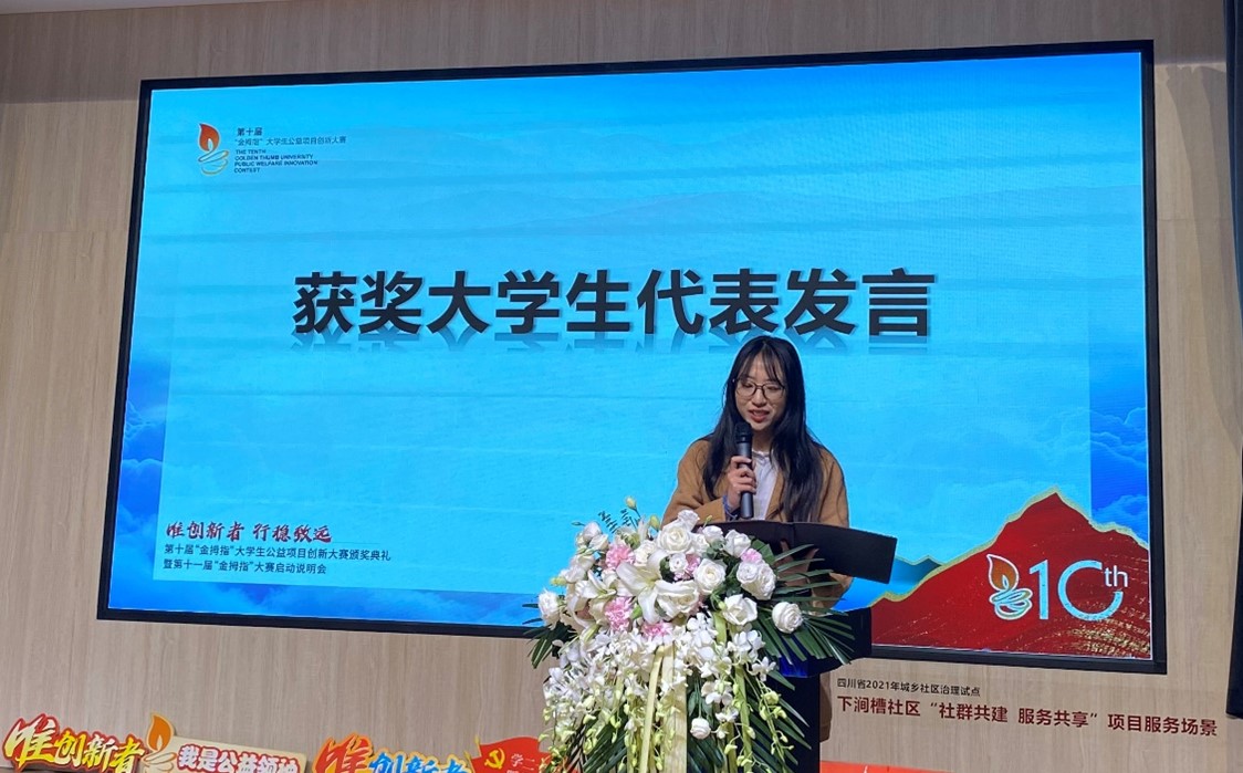 在颁奖典礼现场,公司社会工作2019级本科生谢圆圆、邓杰作为获奖老员工代表,分别就比赛经验和项目实施心得进行了分享。社会学与心理学系何明洁副教授作为最佳指导老师代表发言致辞。何老师指出,“金拇指”大赛的成功举办离不开合作社区、社会组织伙伴、锦基金以及各位指导老师的共同努力,各个社会公益主体形成合力,为社会工作老员工培养实务能力搭建了优质平台,孕育了社会公益创新的肥沃土壤,有助于推动我国社会工作力量的专业化、本土化建设。
