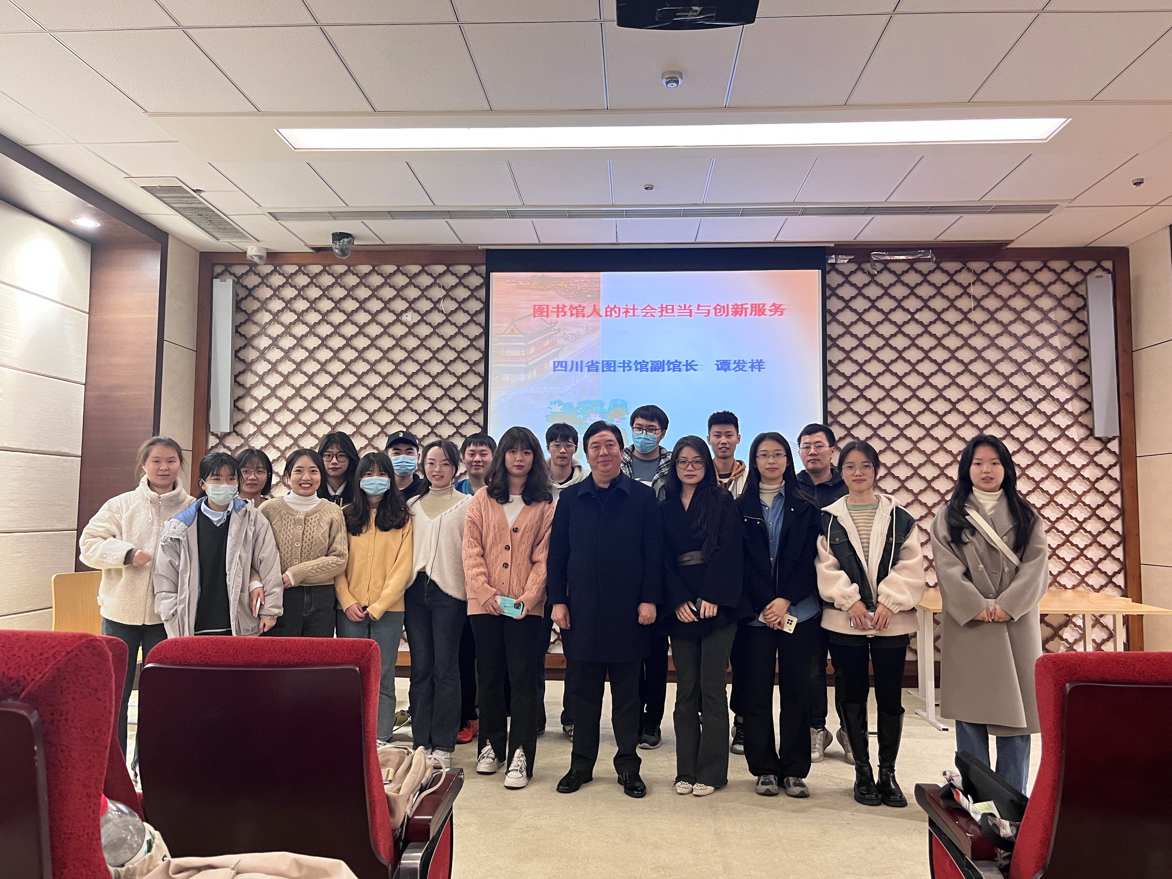 为进一步加深图书情报专业研究生对行业与职业的认知,在专硕核心课程《现代信息机构管理实务》负责人党跃武教授的精心设计与组织安排下,3月23日上午,2022级图书情报专业全体研究生在四川省图书馆顺利开展了线下学习实践活动。四川省图书馆副馆长、好博图书情报专业实践导师谭发祥老师热情接待并主持召开学习讲座,与同学们交流探讨了图书馆服务和专业担当话题。