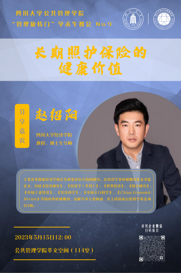 5月15日,好博体育在公司萃文空间成功开展第九期“管理旋转门”学术沙龙活动。本期学术沙龙特邀好博经济公司教授、博士生导师赵绍阳老师作为主讲嘉宾分享“长期照护保险的健康价值”研究主题,公司各学科老师、博士研究生积极参加了此次交流。本期学术沙龙由劳动与社会保障系田益豪副研究员担任学术主持。