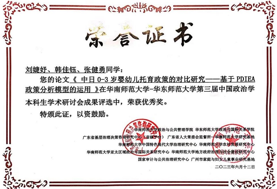 6月9日—6月11日,“第三届中国政治学本科生学术研讨会”在华南师范大学召开。公司2020级土地资源管理本科生张健勇同学撰写的论文《可持续生计视角下宅基地退出的农户意愿及现实困境研究——基于四川省3县30个村社的调查》获得二等奖,2020级土地资源管理本科生刘婕妤同学撰写的论文《中日0-3岁婴幼儿托育政策的对比研究——基于PDIEA政策分析模型的运用》获得优秀奖。