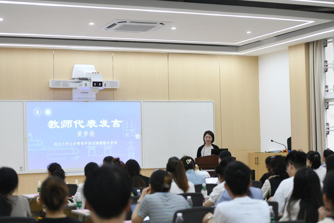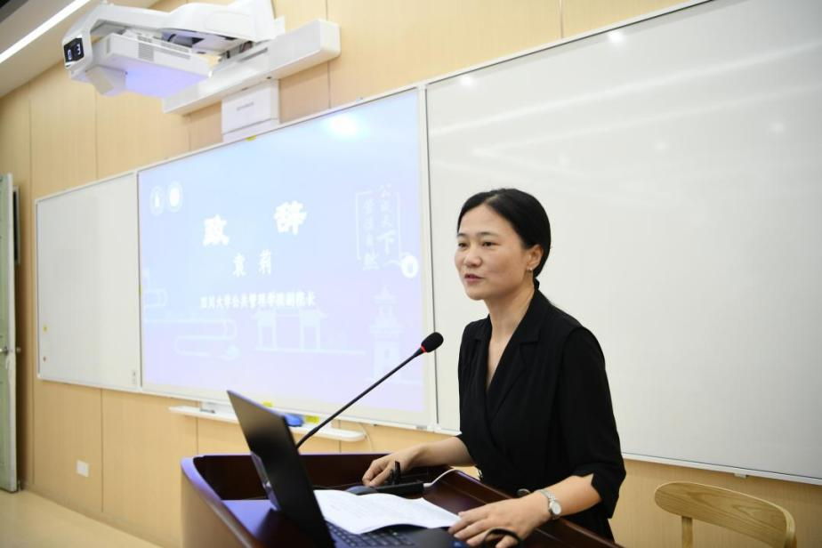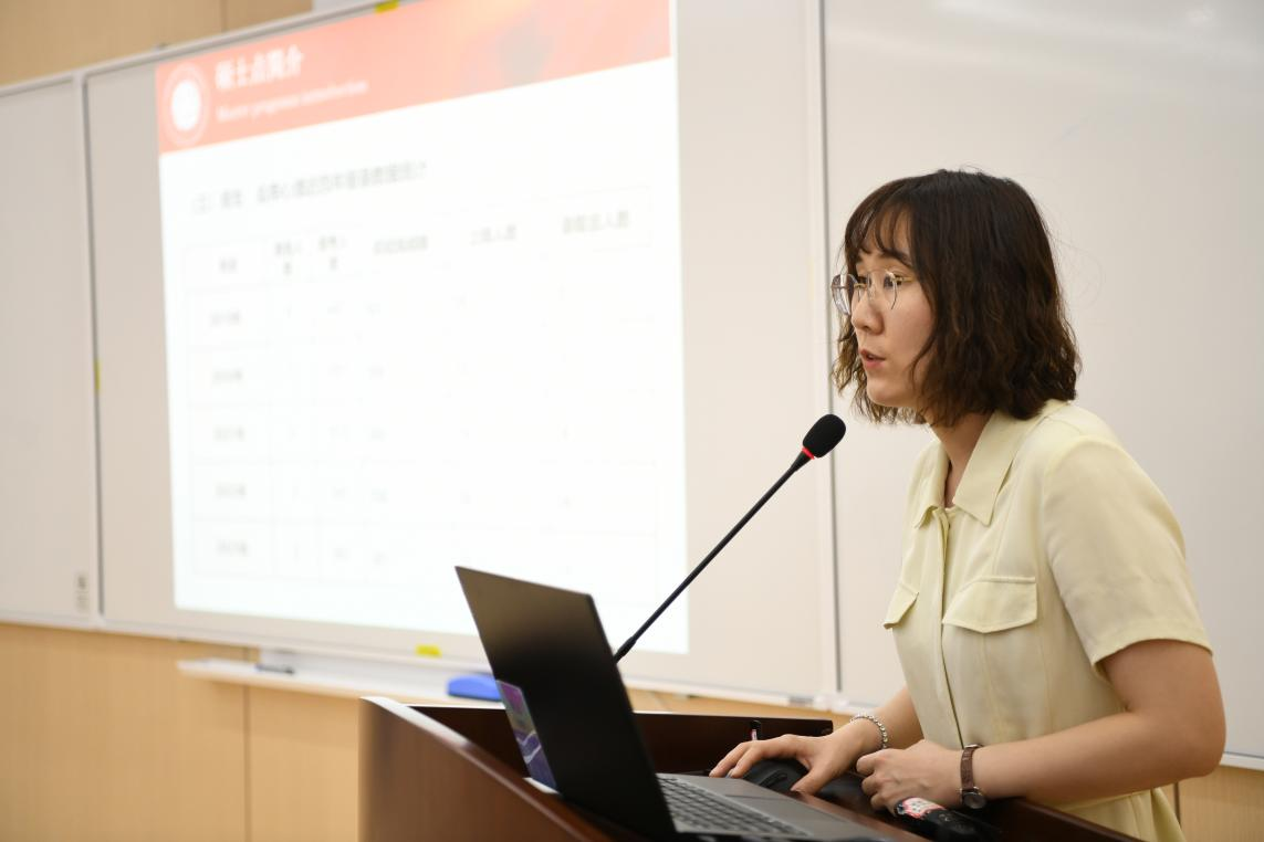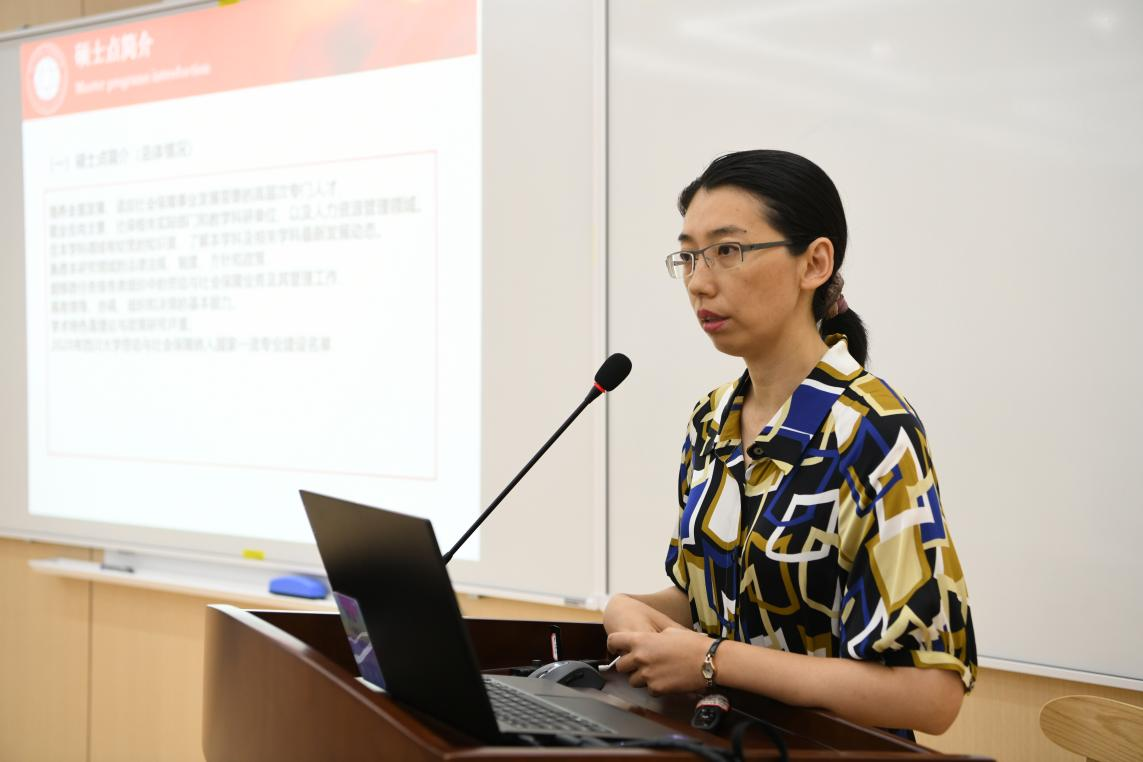 开营仪式的第二个部分是公司和学科介绍。首先,教学管理科科长李岚老师从扎实的团队建设、雄厚的团队力量、丰硕的学术成果、优秀的生源质量以及完备的奖助体系等方面对公司学科发展,专业设置以及研究生招生、培养等情况做了全面介绍。接着,社会保障专业张浩淼教授和应用心理学专业李诗颖副教授分别从学科方向、团队队伍、员工发展等方面介绍了各专业的培养特色和培养要求,鼓励同学们报考川大,圆梦川大。