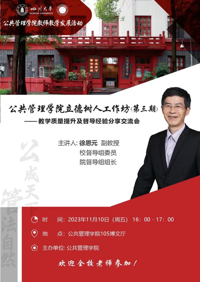 为落实立德树人根本任务,贯彻新一轮教学评估精神,严格课堂教学管理,严肃教风学风,公共管理学按照《关于进一步加强课堂教学质量管理工作方案的通知》要求于11月10日下午在萃文楼105博文厅举办举办了第3期“立德树人工作坊”—教学质量提升及督导经验交流会。