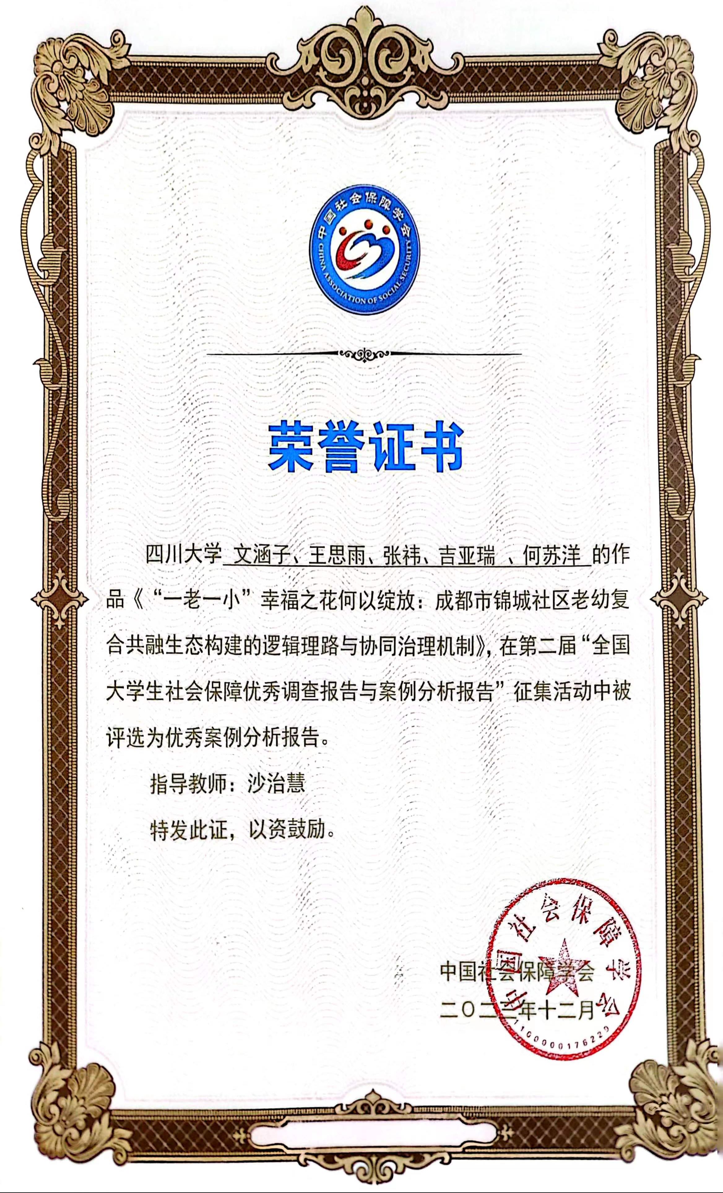 由公司劳动与社会保障系沙治慧教授指导,由劳动与社会保障系的文涵子、王思雨、张祎、吉亚瑞、何苏洋同学共同努力完成的《“一老一小”幸福之花何以绽放:成都市锦城社区老幼复合共融生态构建的逻辑理路与协同治理机制》案例分析报告,成功入选优秀案例分析报告。