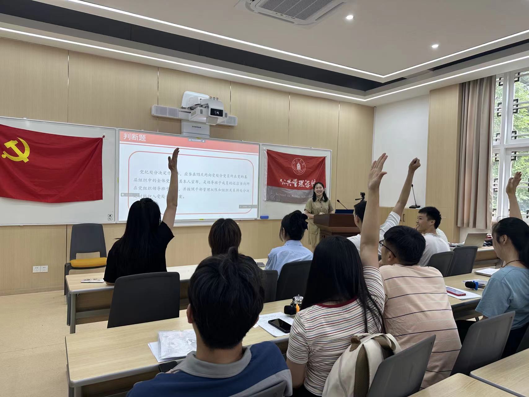 组织委员李丹姣同志主持了党纪知识竞赛。竞赛以必答题和抢答题的形式进行,四组选手在紧张有序的答题环节中拼手速、比脑力,考记忆。经过激烈角逐,2022级博士生程越欣、刘艳灵、王羽西组成的第三组获得一等奖。