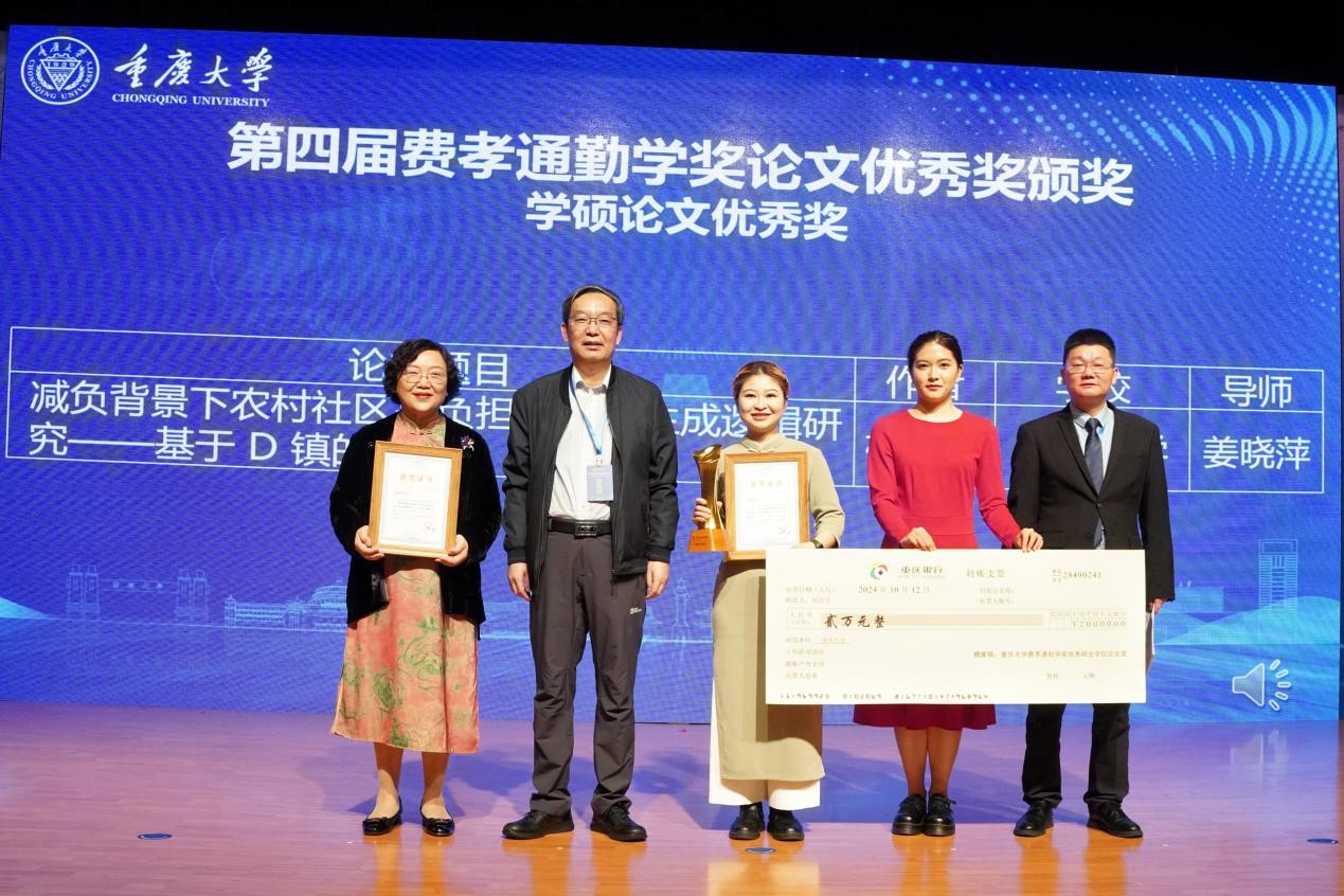 10月12日,第四届“费孝通勤学奖”颁奖典礼在重庆大学举行。继公司2020届硕士白浩然同学获得第三届“费孝通勤学奖”唯一优秀硕士学位论文奖(指导教师李晓梅)以来,杨舒雯、史军、郑冰鑫3位同学在本届评选中再创佳绩。
