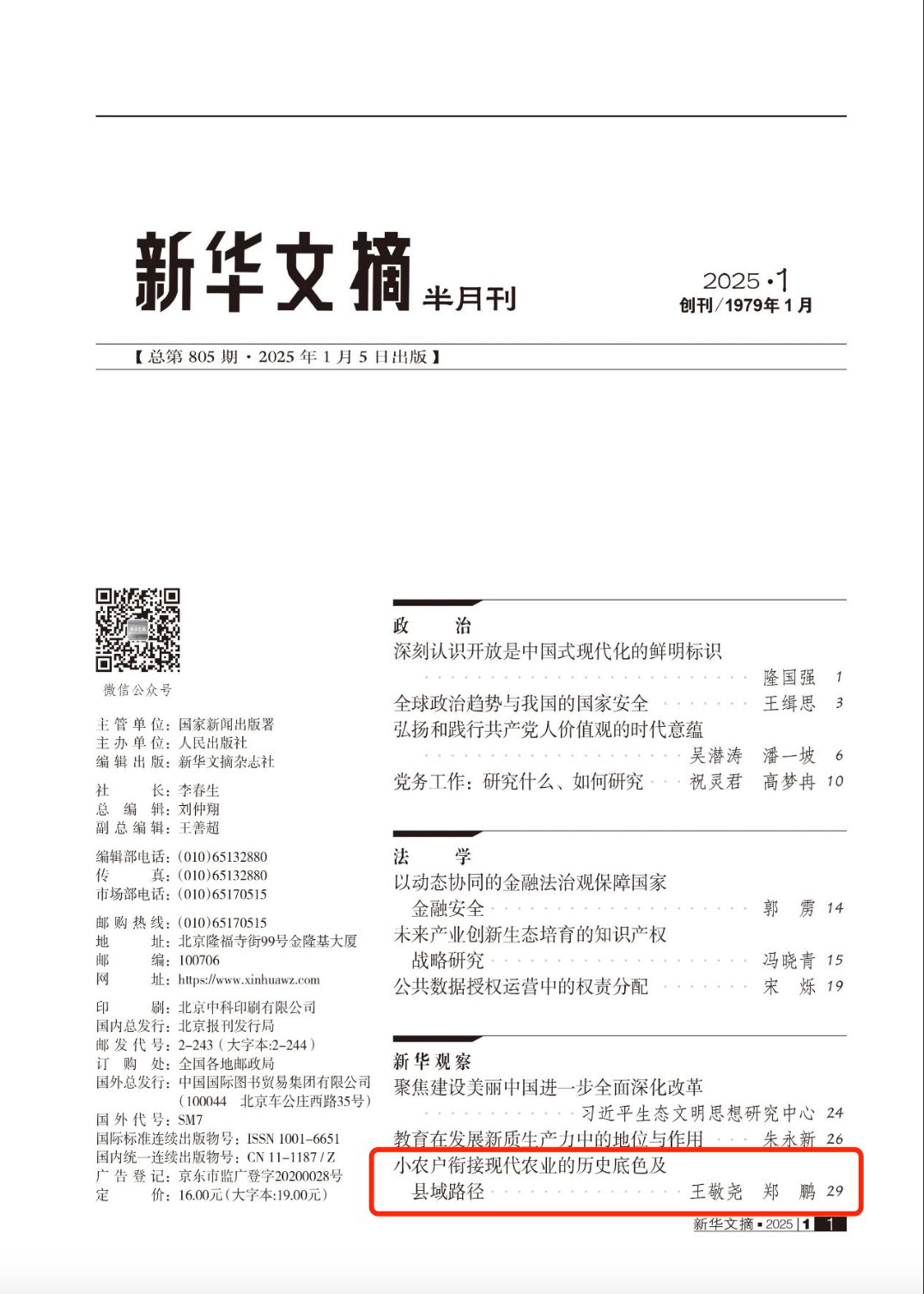1月5日出版的《新华文摘》(2025年第1期)转载了公司王敬尧教授、郑鹏博士生的合著论文。
