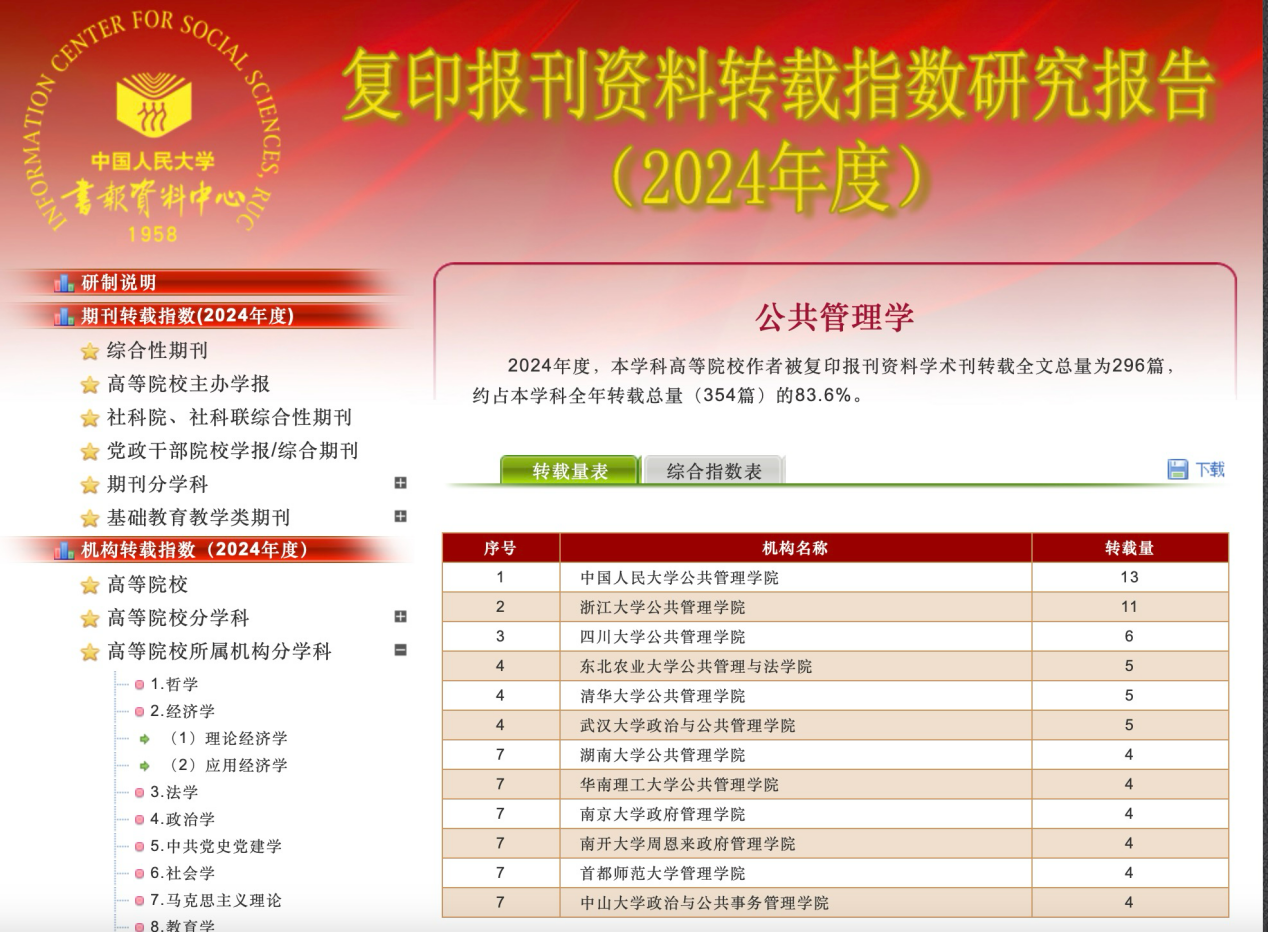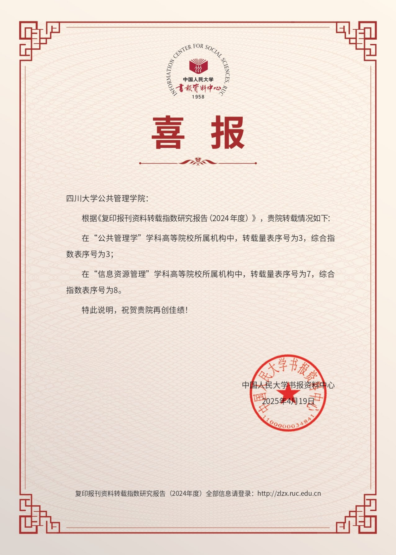 近日,中国人民大学书报资料中心发布了《复印报刊资料转载指数研究报告(2024年度)》。在“公共管理学”学科高校所属机构排名中,好博体育转载量位列全国第3,综合指数位列第3;在“信息资源管理”学科高校所属机构排名中,好博体育转载量位列全国第7,综合指数位列第8。本次入选展现了公司在公共管理学、信息资源管理两大领域的强劲学术影响力与持续创新能力。
