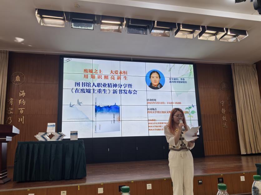 随后,本次分享会特邀北川图书馆原馆长、《在废墟中重生》作者李春老师以亲历者视角,为大家深情讲述了汶川5·12大地震后北川图书馆浴火重生的艰难历程。在重建过程中,图书馆人克服余震频发的安全威胁,在艰苦条件下开展图书抢救与废墟清理工作。从基础功能恢复到服务体系优化,最终实现北川图书馆从震前县级三级图书馆向国家级一级图书馆的跨越式发展。这一蜕变生动诠释了在党中央“以人为本、尊重科学、不畏艰险、百折不挠”的抗震救灾精神指引下,图书馆工作者为人民服务、为文化事业拼搏的担当与奉献。
