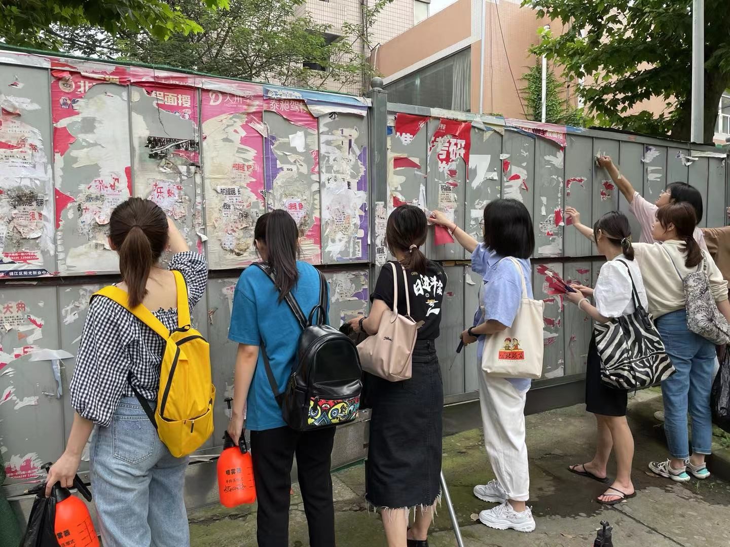同学们分成四个小组,携带准备好的铲刀、喷壶等工具,对东苑员工食堂以及宿舍楼附近的“小广告和牛皮癣”进行清除。后勤环保队的罗老师简单地教授了同学们高效铲除的方法,并与后勤保障部杨老师共同带领同学们正式开展活动。同学们认真地清理着每一个广告和牛皮癣,对有些粘贴紧不易清理的小广告,用手将其撕离墙体,不给“小广告和牛皮癣”留下一点生存的空间。大家干劲十足、不计辛苦,经过近3多小时的辛苦劳动,东苑食堂附近的树、路灯柱及电线杆焕然一新。