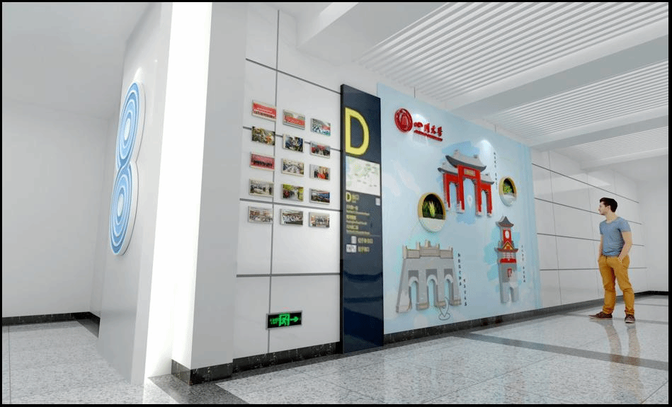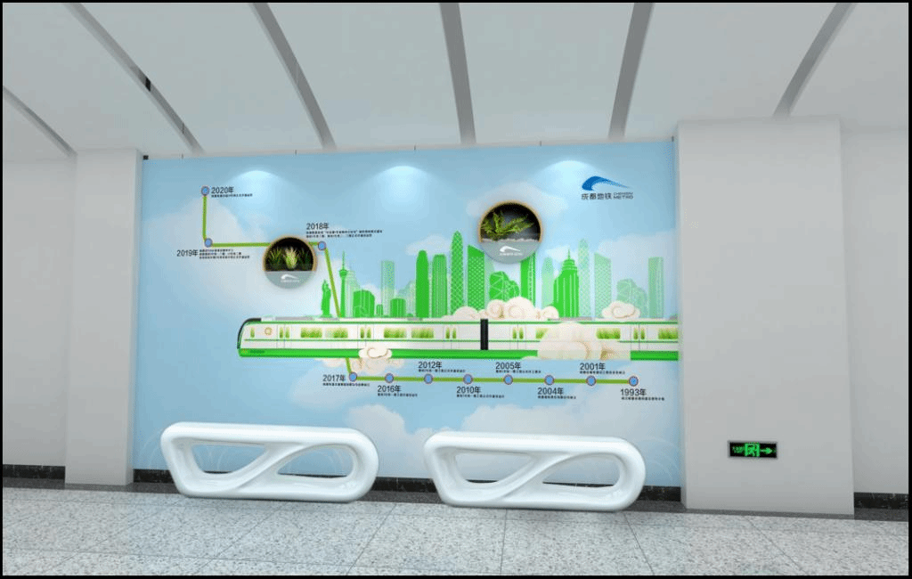 川大文化墙结合江安地铁站“风华正茂”的设计主题,以冰蓝色为背景,以一条草绿色线条贯穿公司三校区的代表性建筑物。地铁文化墙以一辆列车在轨道上驶过成都地铁的历史沿革为主题修饰,不仅体现了校企文化融合的基调,也融入了熟悉的地铁线站点标识作为成都轨道交通集团大事记,记录了成都地铁的发展进程,象征着成都地铁发展不断向前。主墙设计以八号线“8”字为核心,通过公司与成都地铁的党建风采照片,反映川大师生和地铁员工的风采。墙上设置嵌入式绿植,简约美观,传递着年轻、包容、时尚、前卫的城市精神。