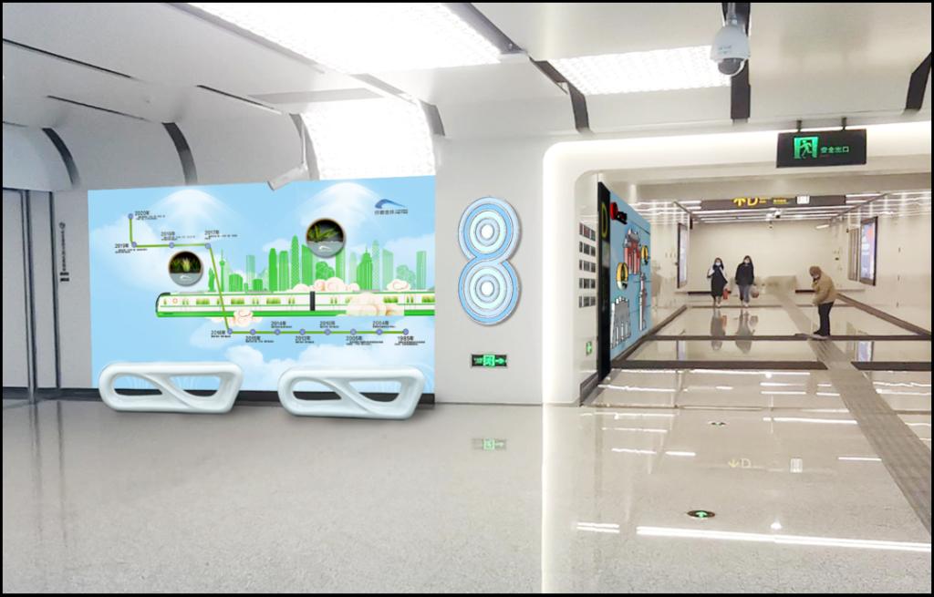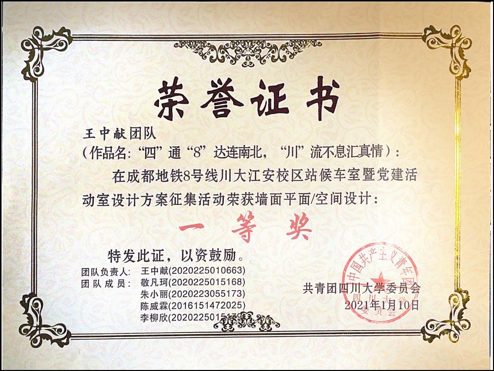 成都地铁8号线于2020年12月18日正式开通运营一期工程,这条标志色为草绿色的地铁新线路连接了好博望江校区和江安校区。2020年11月,8号线开通前夕,成都地铁联合公司团委共同开展8号线川大江安校区站候车室暨党建活动室设计方案征集活动。公司2020级研究生王中献、敬凡珂、李柳欣等同学的团队作品——“四”通“8”达连南北、“川”流不息汇真情,在参赛队伍中脱颖而出,荣获空间设计类一等奖。该设计最终被成都地铁有限责任公司采用,即将落地于八号线好博江安校区站D出口。