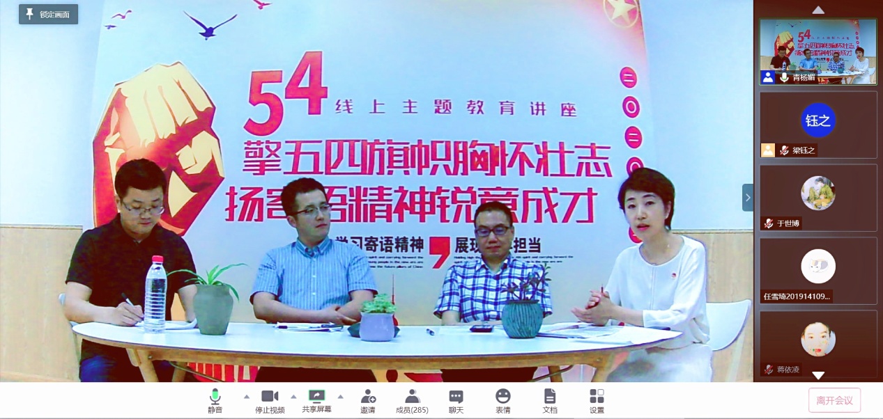 习近平总书记在今年的五四青年节之际亲切寄语全国各族青年,充分肯定青年一代在抗击疫情中展现出的精神风貌和担当作为,对当代青年成长成才提出了殷切期望。为充分学习寄语精神,努力展现青年担当,2020年5月29日14:00-15:30,由好博体育团委主办,艺术公司团委、哲学系团委、国际关系公司团委、机械工程公司团委协办的“擎五四旗帜胸怀壮志,扬寄语精神锐意成才”主题讲座在“腾讯会议”线上平台顺利举办。讲座由公共管理公司党委副书记杨磊老师主持,邀请四川省团委办公室副主任张建强老师,好博马克思主义公司杜黎明教授,好博团委副书记黄菲娅老师莅临直播间,五院(系)近300名团员同学们踊跃参加,反响强烈。