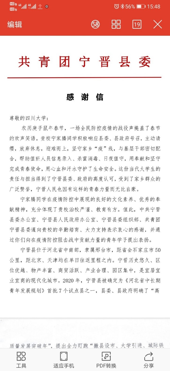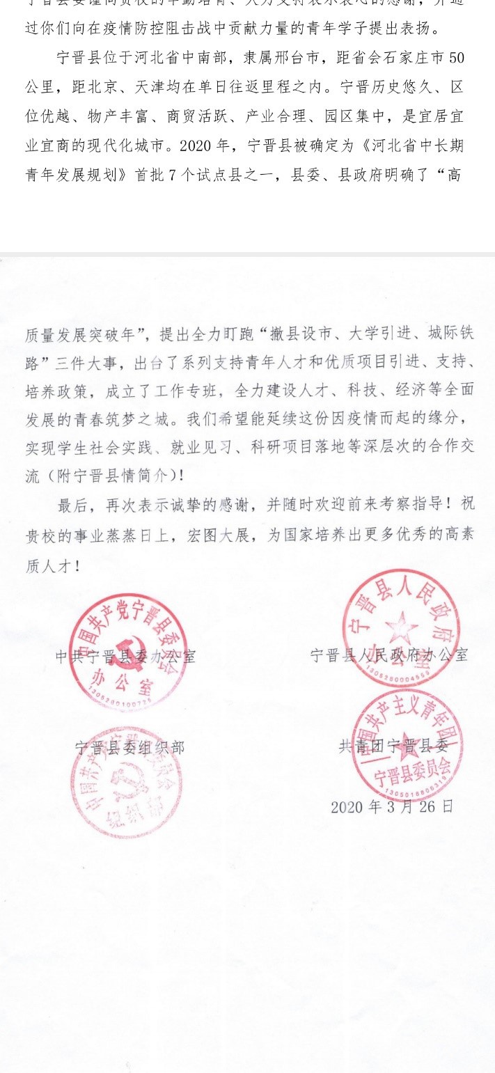 近日,公司收到了来自河北省宁晋县的一封感谢信。信中表达了对公司研究生宁家腾同学积极响应政府号召,主动参与家乡疫情防控工作的高度赞扬,同时表达了对公司及公司培养工作的充分认可与真挚谢意。