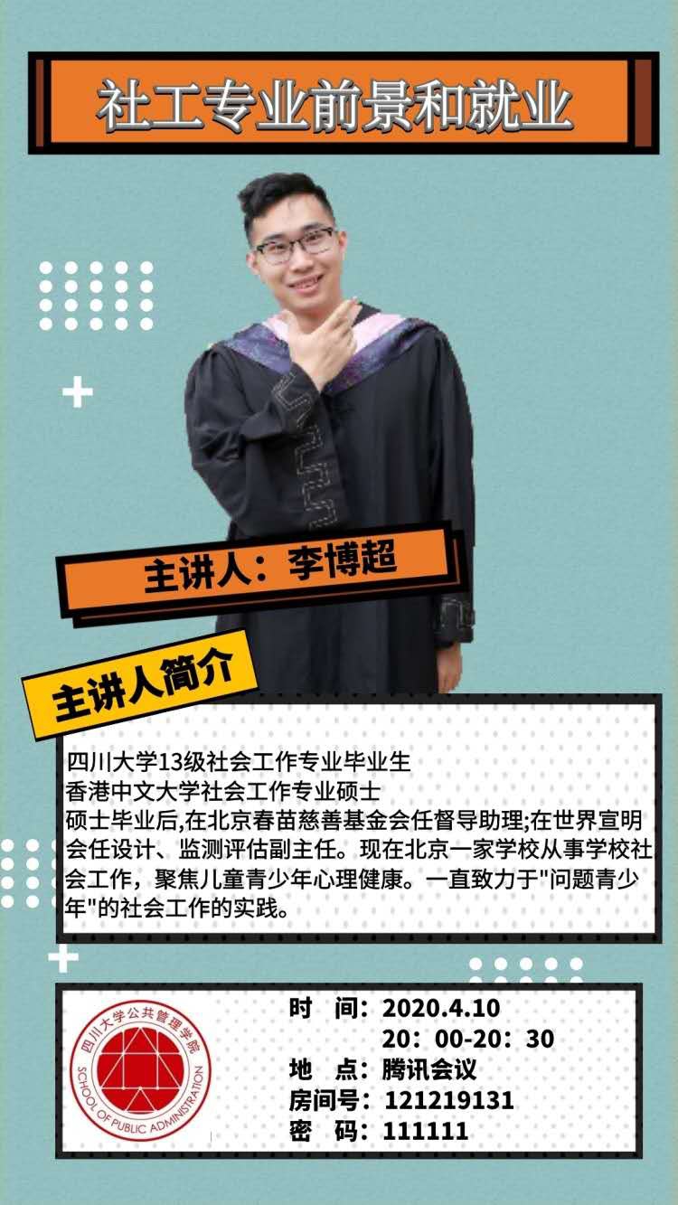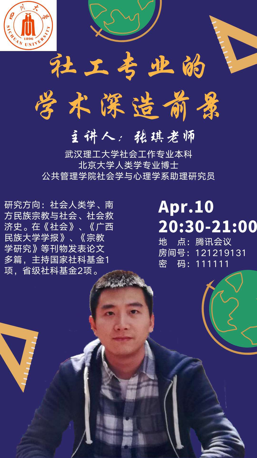 2020年4月10日晚8:00,社会学与心理学系张琪老师与两位社会工作专业培养的优秀毕业生李博超、宋阿沛线上为大一、大三的同学进行了一场别开生面的交流会,为学弟学妹们拨开专业迷雾。