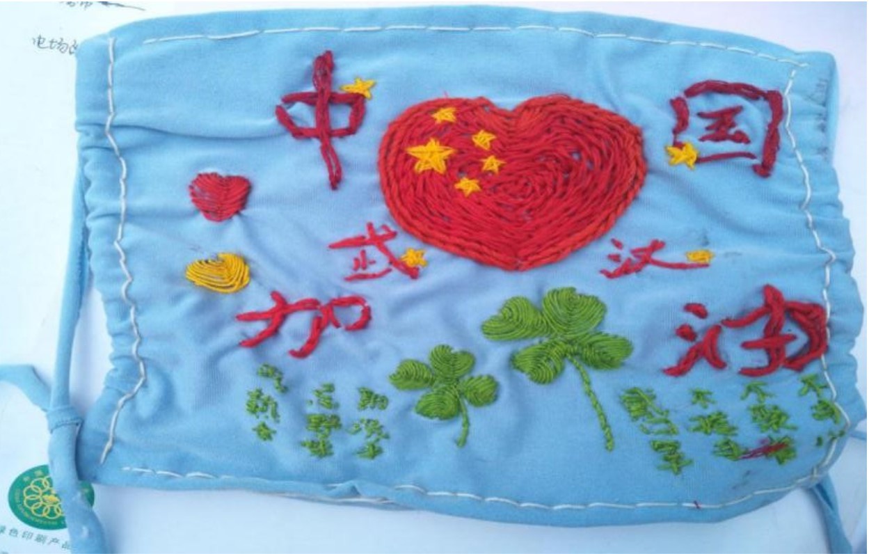 创意口罩作品的作者王青青同学说:“选择特殊时期的‘生活必需品’——口罩是想提醒大家对自己和别人负责,刺绣的爱心和国旗代表着爱祖国,四叶草是希望所有人都平平安安,中国能够幸运地战胜疫情,口罩夹层可夹入其他具有隔离防护效果的材料,用不到也可以当口袋用,绿字是防护建议。”