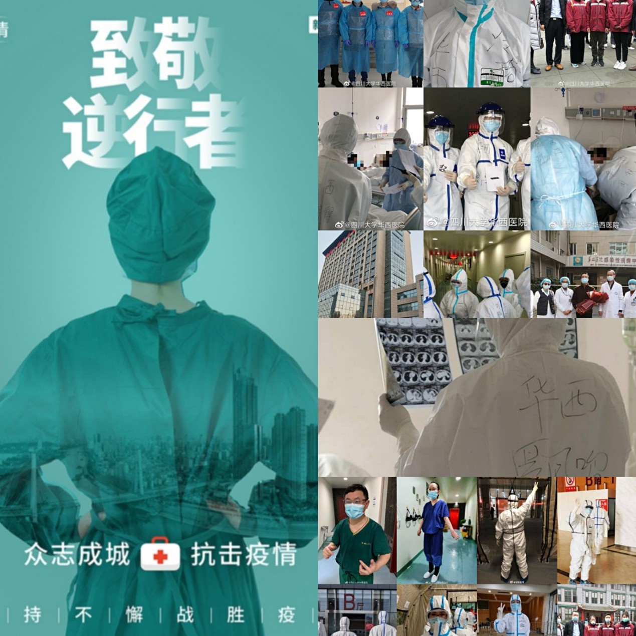 2019级信息资源管理一班团支部的同学们发挥创意,创作了一系列形式丰富的线上文创作品,通过这些作品同学们分享自己所看到的、听到的防疫、战‘疫’的故事。《致敬逆行者》海报作者吴玖搏同学说:“我分享是我们好博华西医院支援武汉和救治新冠病人的特写,在本次疫情中,公司华西医院贡献了巨大力量,前线医护人员无疑也做出了巨大牺牲。作为川大学子,我为公司在抗击疫情中冲锋陷阵的华西人骄傲,更向这些英勇无畏的医护天使致以最崇高的敬意!愿凯旋归来。”