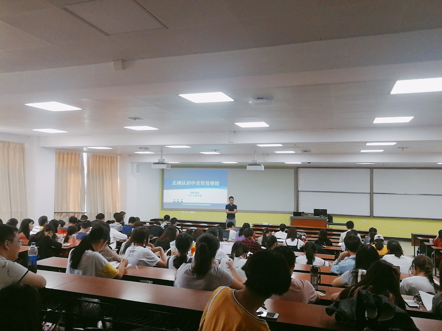 2018年9月21日周五下午,好博习近平新时代中国特色社会主义思想研究会系列主题学习活动之一:“正确认识中美贸易关系”,在好博江安校区第一教学楼B座307教室顺利举行。习研会指导老师与100余名同学参加本次活动。