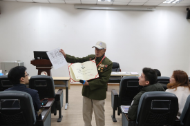 上午9:30,伴着热烈的掌声,身着军装与军功章的抗美援朝战争亲历者——今年90高龄的莫若健老先生迈着坚定的步伐走进教室,站定并向大家敬礼。莫老先生从抗美援朝第一次战役起,历任敌工组副组长、英语翻译、敌工干事、志愿军政治部俘虏管理处助理员、总政英语研究班学员、志愿军参谋公司学员、志愿军速成中学教员等职,1953年被朝鲜政府授予军功章一枚,1956年被哈尔滨市政府评为二等模范,1958年随部队从朝鲜撤军回国。本次分享,莫老先生围绕中美双方对朝鲜战争的评价以及他在战争中的经历,向大家呈现了那场伟大战争的生动片段。