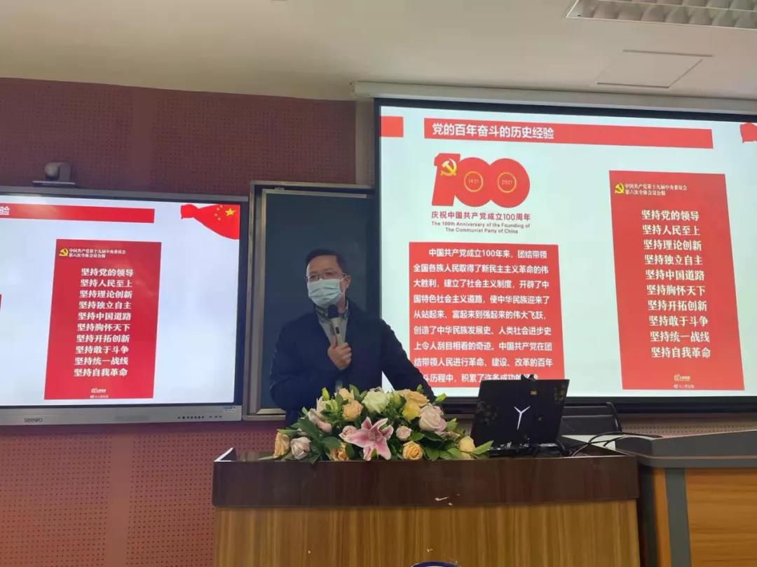 随后,蒋文涛老师就党的十九届六中全会擘画的远景目标和青年员工的奋斗方向进行了展望。蒋老师向大家介绍了从改革开放以来历届六中全会的主题,分析了本届六中全会的选题原因及重要性。紧接着,蒋老师就十九届六中全会《决议》中提出的精神进行了解读,从党领导下我国社会发展的四个重要阶段分析了党的历届全会精神对中国社会主义发展的深远影响,强调党领导下的中国人民成功实现了从“站起来”“强起来”到“富起来”的华丽转变。最后,蒋文涛老师还详细解读了具有根本性和长远指导意义的十条历史经验即“十个坚持”,并对习近平新时代中国特色社会主义思想实现马克思主义中国化新的飞跃进行探讨。