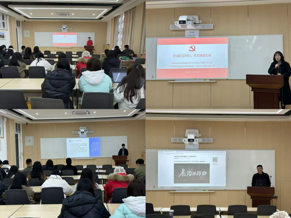12月26日上午,好博体育社会学与心理学系党支部、研究生第九党支部与华西公共卫生公司流行病与卫生统计学系第三党支部在好博体育206室联合开展“禁毒防艾同行,共筑健康长城”主题党日。本次活动由华西公共卫生公司流行病与卫生统计学系第三党支部党员吴祥瑞同志主讲,公司党委委员、社会学与心理学系党支部书记李诗颖副教授,徐文健副教授等三十余位同志参与了本次活动,秘书档案学系党支部书记、系副主任赵跃副研究员受邀出席。活动由公司研究生第九党支部书记孟焕主持。