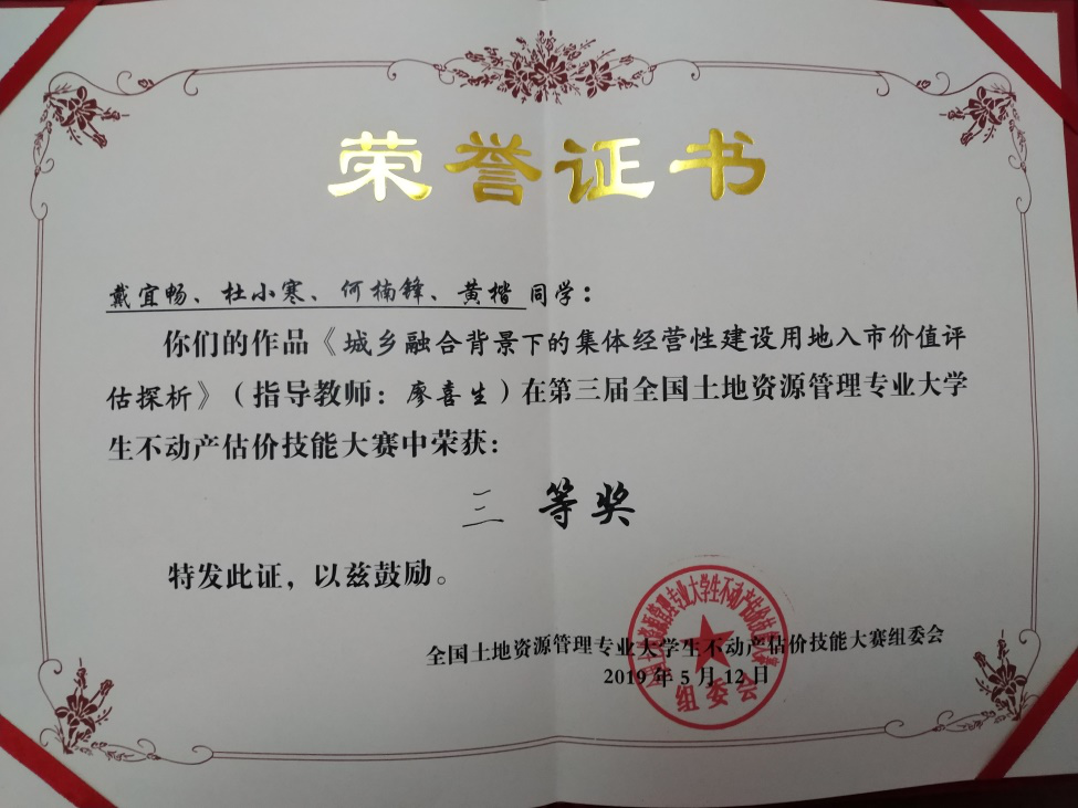 2019年5月11日至5月12日,“第三届全国老员工不动产估价技能大赛暨不动产教学研讨会”在江苏徐州的中国矿业大学举行,公司廖喜生老师指导的2016级土地资源管理专业的四名员工(戴宜畅、杜小寒、何楠锋、黄楷)参加了竞赛,其小组作品《城乡融合背景下农村集体经营性建设用地入市价值评估》成功入围决赛,并最终获得三等奖。